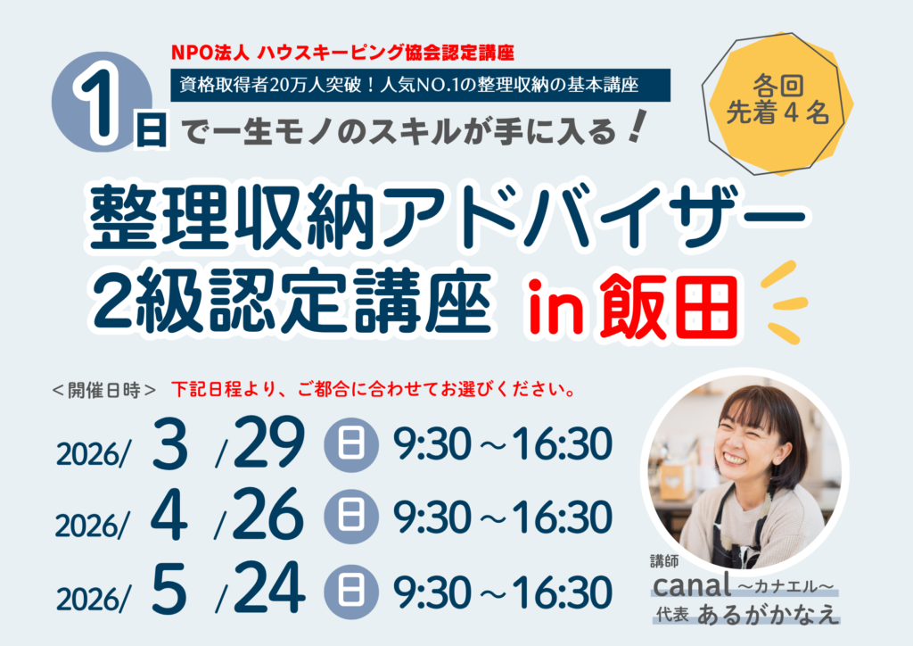 2025年2月14日 / 最終更新日時 : 2025年2月20日 canal.seirishuno 自己紹介 はじめまして! ご訪問ありがとうございます。整理収納アドバイザー1級資格保有canal~カナエル~ あるがかなえです。 南信州から全国へ整理収納で暮らしを整える方法をお伝えしています。 東京都八王子市出身。長野県飯田市在住。主人、長男( […]